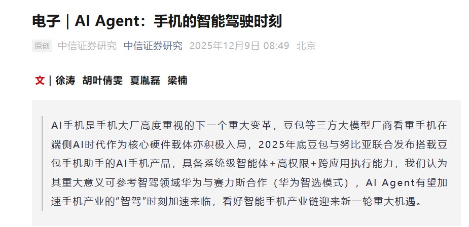 中信证券在 12 月 5 日的研报中指出,AI Agent 之于手机,正如自动驾驶之于汽车。此前,手机厂商苦于缺乏能够打通所有 APP 的超级入口,而 AutoGLM 的开源为荣耀、小米、OPPO 等厂商,甚至中小硬件开发者提供了现成的技术底座。参考汽车行业 “华为 + 赛力斯” 的智选模式,未来 “大模型厂商 + 手机厂商” 的深度绑定将成为常态,AI 手机有望迎来类似新能源汽车的爆发式增长。