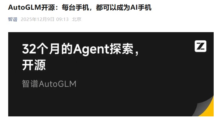 12 月 9 日早间,国内头部大模型厂商智谱 AI 正式宣布开源其核心 AI Agent 模型——AutoGLM。这是一个历经 32 个月研发、具备 “Phone Use”(手机操作)能力的智能体框架。