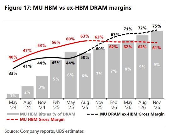 UBS predicts: Micron's traditional memory DDR gross margin will exceed HBM for the first time