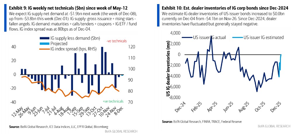 相比之下,高收益债(HY)市场原本预期的 “圣诞反弹” 面临挑战。受 AI 驱动的波动性、美联储预期转变以及数据延迟发布的影响,12 月的行情充满了不确定性。尽管从季节性技术面来看通常较为强劲,但目前股市因估值担忧表现平平,可能拖累高收益债表现。