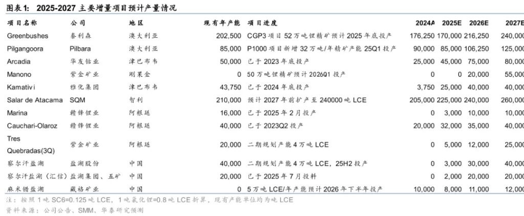 受当前价格上涨影响,供给端增量或在 26 年加速释放,27 年供给释放速度或明显放缓。国内方面,根据公司公告,盐湖股份 4 万吨/年和青海汇信 2 万吨/年的察尔汗盐湖项目已分别于 2025 年 9 月底和 2025 年 6 月投料生产,我们预计 2026 年将放量;非洲方面,华友钴业硫酸锂项目已于 2025 年下半年投产,雅化集团 Kamativi 矿以及赣锋锂业 Goulamina 矿我们预计在 2026 年将完成达产。另根据公司公告,紫金矿业 Manono 矿 50 万吨/年锂精矿项目计划于 2026 年第一季度投产,折合硫酸锂 9.5 万吨;澳矿方面,格林布什 CGP3 项目 52 万吨锂精矿产能预计 2025 年底投产,对应约 6.5 万吨 LCE;Pilbara 的 P1000 扩建项目已于 2025 年第一季度试运行,有望在 2026 年逐步释放。上述项目投产释放主要集中在 26 年,而 27 年新增项目预期明显减少,供给增速或显著下滑。