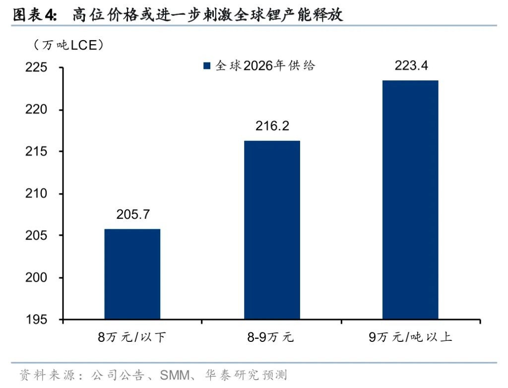 26 年供需基本面定价下的价格约 8-9 万元/吨。基于前述分析,我们结合不同价格下的预计全球碳酸锂供给量及不同国内新能源车与储能增速假设下的总碳酸锂需求,测算了各需求情景下对应的基本面支撑价格。在最乐观的假设下,2026 年总需求预计为 216.8 万吨 LCE,碳酸锂基本面支撑价格或在 9 万元/吨左右,在国内新能源汽车渗透率/储能增速分别为 60%/75% 的偏中性假设下,2026 年总需求预计为 207.2 万吨 LCE,对应碳酸锂价格中枢约为 8-9 万元/吨水平,该价格水平下全球碳酸锂供给预计为 216.2 万吨 LCE。