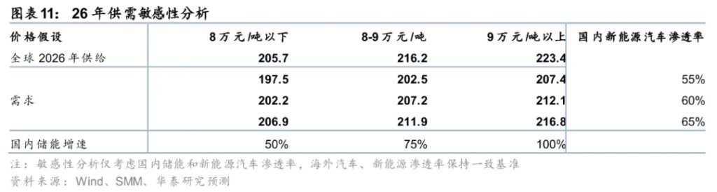 根据我们对 26 年供需的测算,需求中性、乐观预期下,达到平衡状态的价格中枢均在 8-9 万元/吨,因此我们认为 26 年基本面定价下的碳酸锂价格区间或在 8-9 万元/吨。而由于预期 27 年全球锂资源供需关系或走向短缺,短缺预期或推升价格在 26 年下半年提前启动,有望再次突破 10 万元/吨。考虑下游对于碳酸锂价格的敏感程度相对较低,我们认为若 27 年出现持续短缺去库情况,碳酸锂价格上行空间或进一步打开,有望上涨至 12 万元/吨。