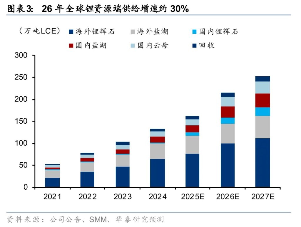 供给:预计锂资源 26 年/27 年产量增速为 32.3%/17.1%