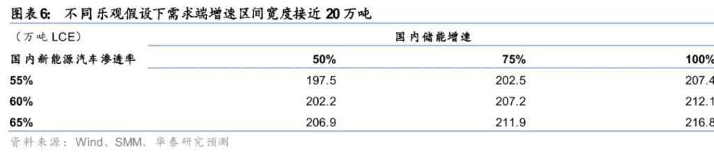乐观、悲观假设下的需求端存在较大的增速分歧。我们分别假设国内储能增速为 50%、75%、100%,以及国内新能源汽车渗透率为 55%、60%、65%,据此构建九种乐观情景组合。我们测算得出对应总需求区间为 197.5 万吨至 216.8 万吨,区间宽度接近 20 万吨。