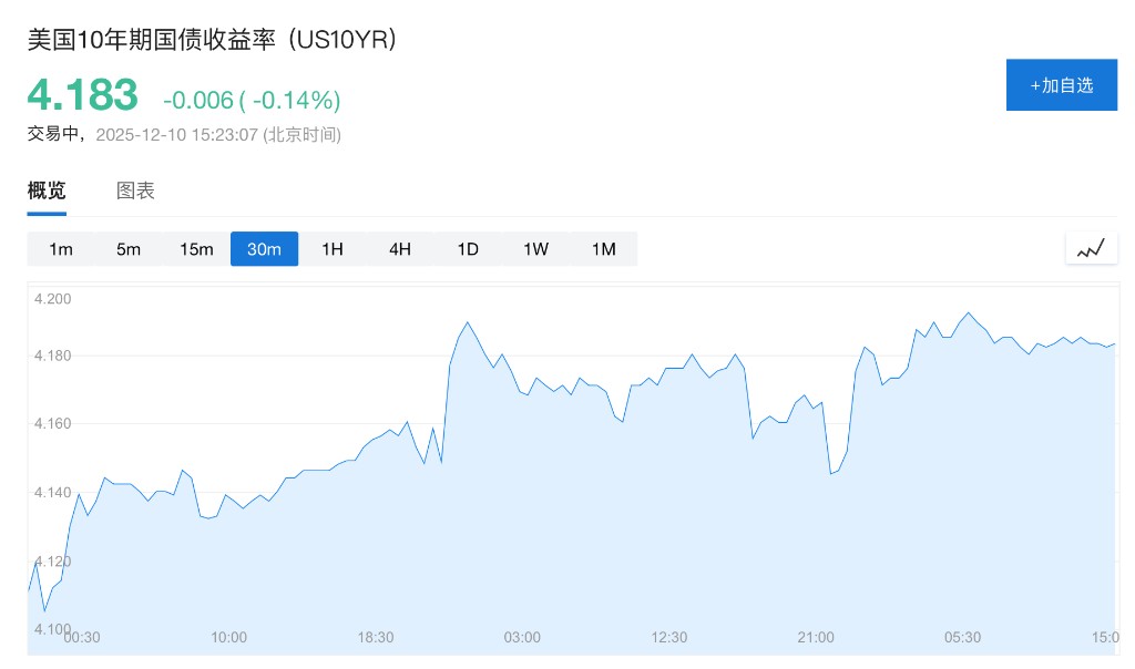 12 月 10 日,美股指期货基本持平,欧股开盘走低,亚洲股市涨跌互现。美债收益率高位盘整,美元、日元承压。商品表现分化,金价小幅回落,白银在突破新高后延续涨势,油价企稳,加密货币小幅上涨。