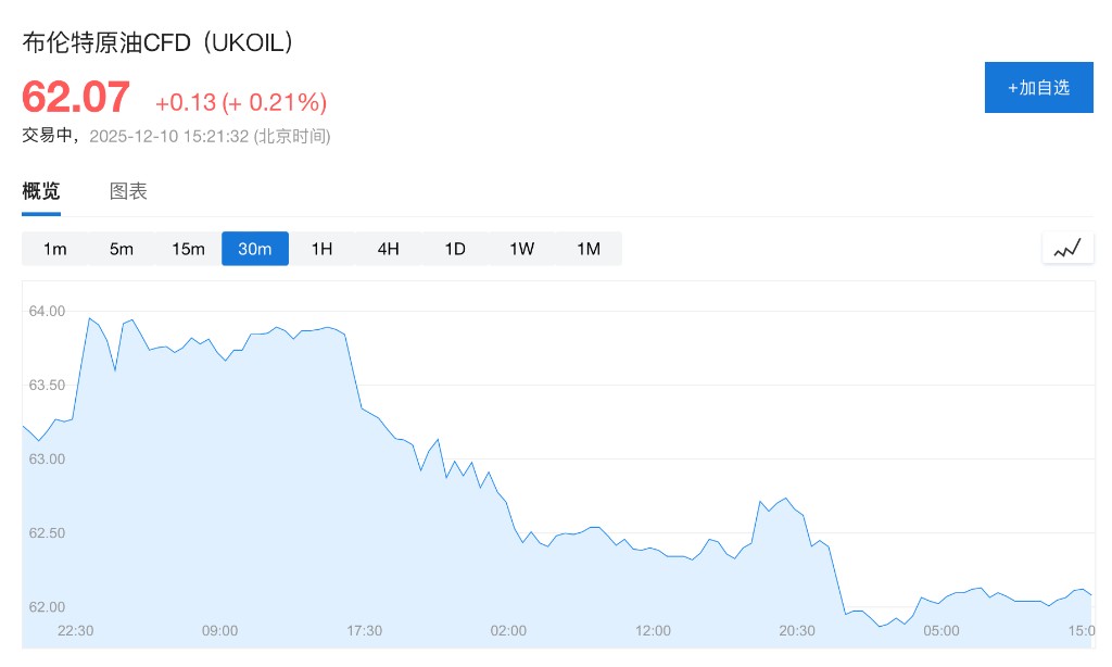 布伦特原油在经历昨日大幅下跌企稳,涨超 0.2% 至每桶 62.07 美元。投资者正密切关注俄乌和谈进展,据新华社,泽连斯基表示,初版 28 点 “和平计划” 已经拆分成三个文件,分别是一份 20 点框架协议、一份美欧对乌安全保障文件,以及一份关于乌克兰战后重建的文件。他表示,若美欧能确保选举安全,乌克兰愿意在 60 至 90 天内举行选举。