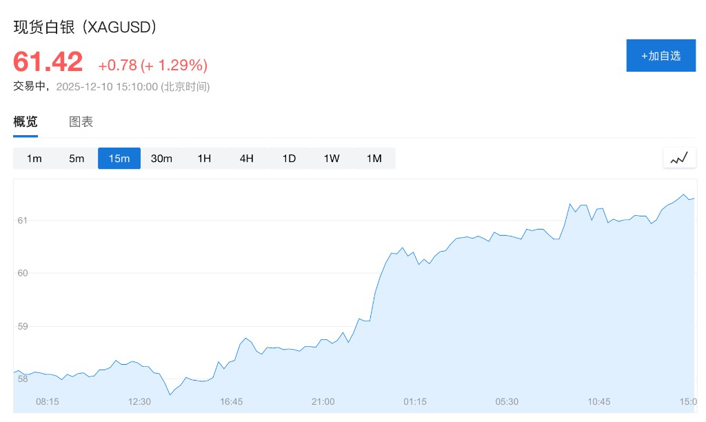 现货白银创历史新高延续涨势,涨近 1.3% 至 61.42 美元/盎司,主要受到全球供应紧张以及对美联储将进一步放松货币政策的预期推动。法国巴黎银行大宗商品策略总监大卫·威尔逊表示:“白银拥有庞大的零售和投机基础。一旦价格出现上涨势头,往往会吸引更多资金流入。”