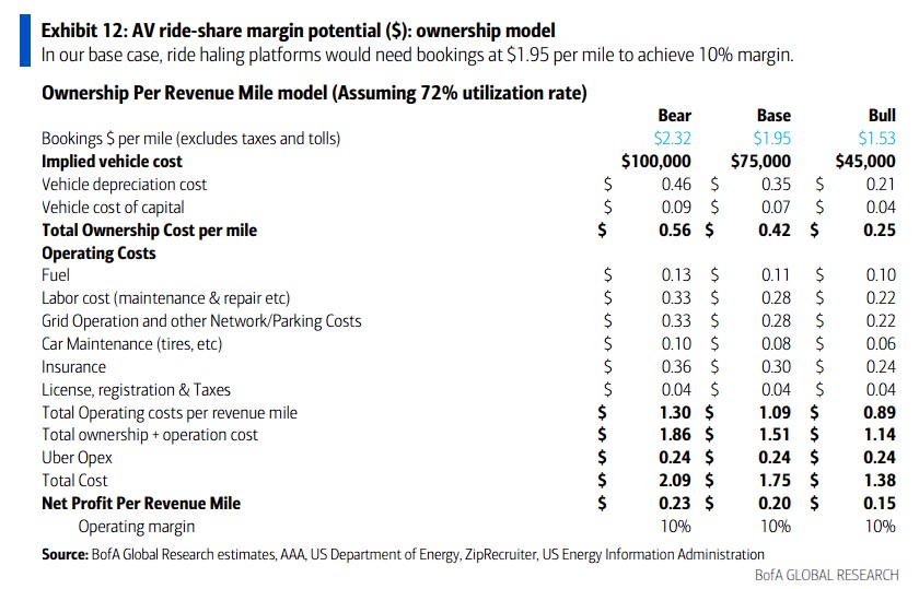 美银认为,若自动驾驶网约车能将每英里成本降至 2.00 美元以下,将成为推动其大规模普及的临界点。