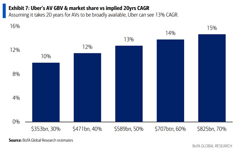 乐观情景下,若优步守住 70% 市场份额,订单量可达 8250 亿美元,年复合增长率达 20%。