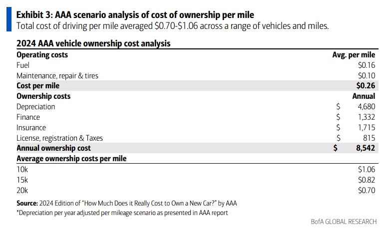 研报指出,自动驾驶技术被视为打破这一瓶颈的关键。美国汽车协会数据显示,私家车每英里综合持有成本为 0.70-1.06 美元,涵盖燃油、保养、保险、折旧等各项费用。而当前美国网约车每英里成本普遍在 2.5-3.0 美元,巨大的价格差距使多数消费者从经济角度选择保有私家车。