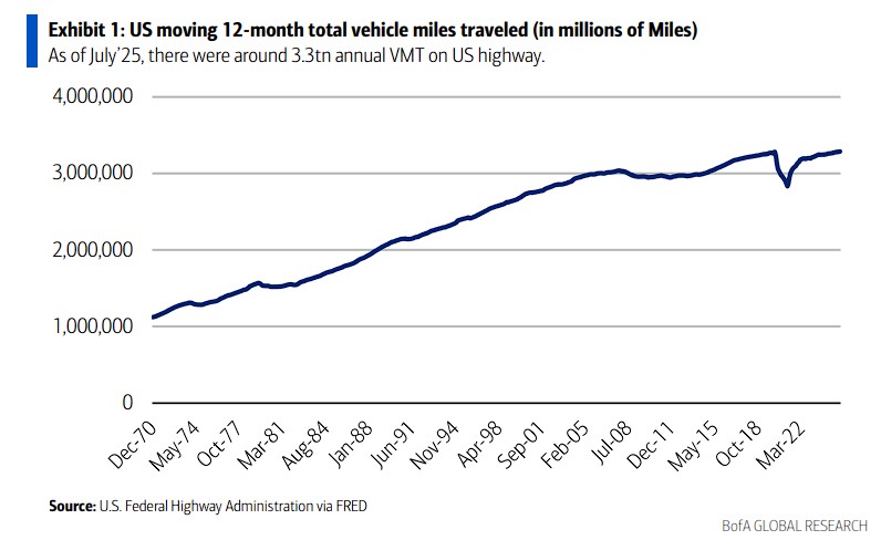 研报称,美国联邦公路管理局数据显示,截至 2025 年 7 月的 12 个月内,美国汽车总行驶里程约 3.30 万亿英里。剔除占比约 10.4% 的大型货车里程后,乘用车年均行驶里程约 3 万亿英里。