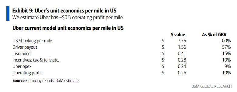 美银通过拆解成本结构,测算了 Uber 维持约 10% 利润率所需的每英里车费盈亏平衡点。