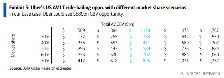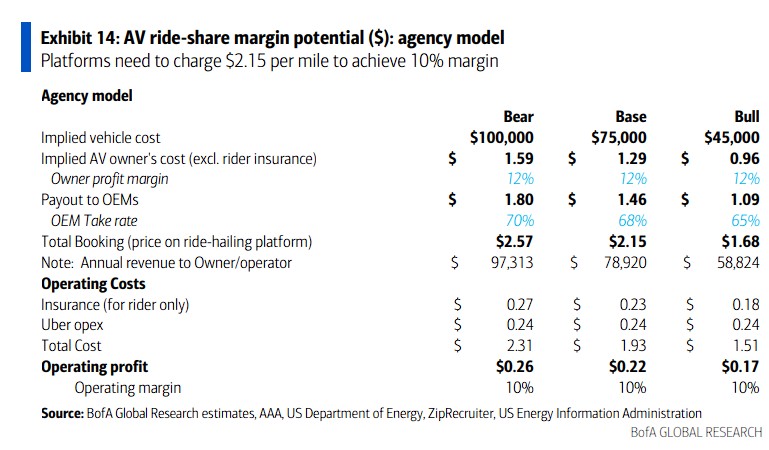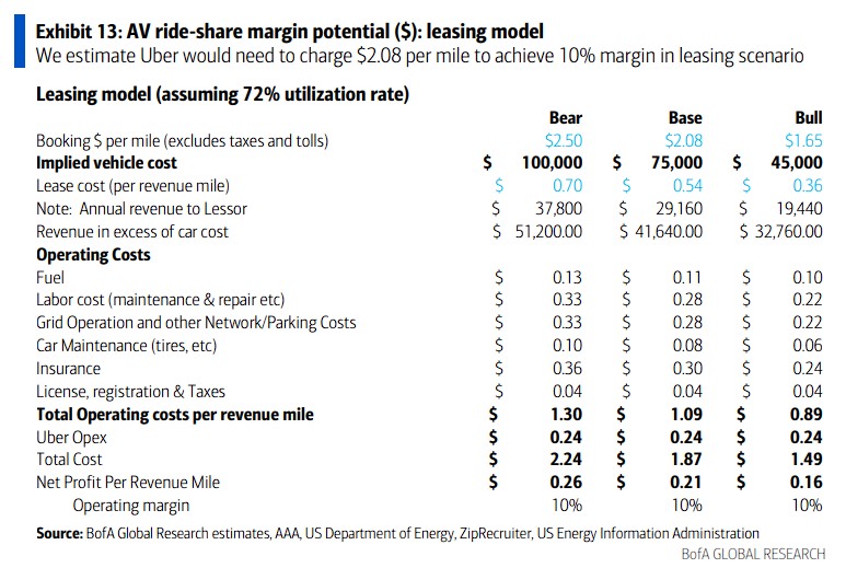 针对 Uber 首席执行官 Dara Khosrowshahi 提出的所有权、租赁、代理三种自动驾驶商业模式,美银分别进行了测算。