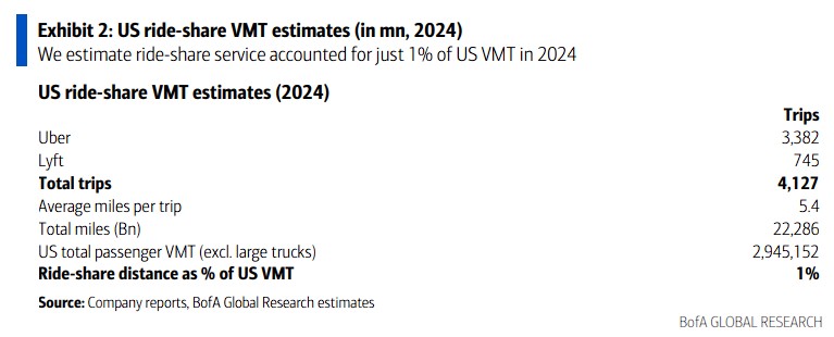 目前网约车服务对这一庞大市场的渗透极为有限。美银基于 Uber 30% 订单、Lyft 90% 订单为美国本土业务,以及平均单次行程 5.4 英里的假设测算,2024 年美国网约车行驶里程仅占全国总里程的 1%。