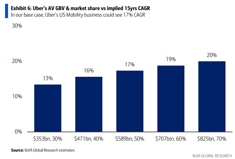 在基准情景中,若优步市场份额降至 50%,假设到 2040 年自动驾驶全面普及、市场规模达 1.2 万亿美元,优步订单量有望增至 5890 亿美元,对应 15 年年复合增长率 17%。