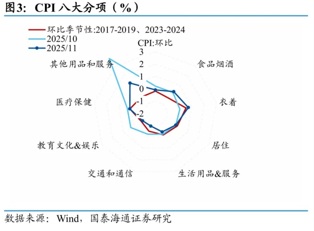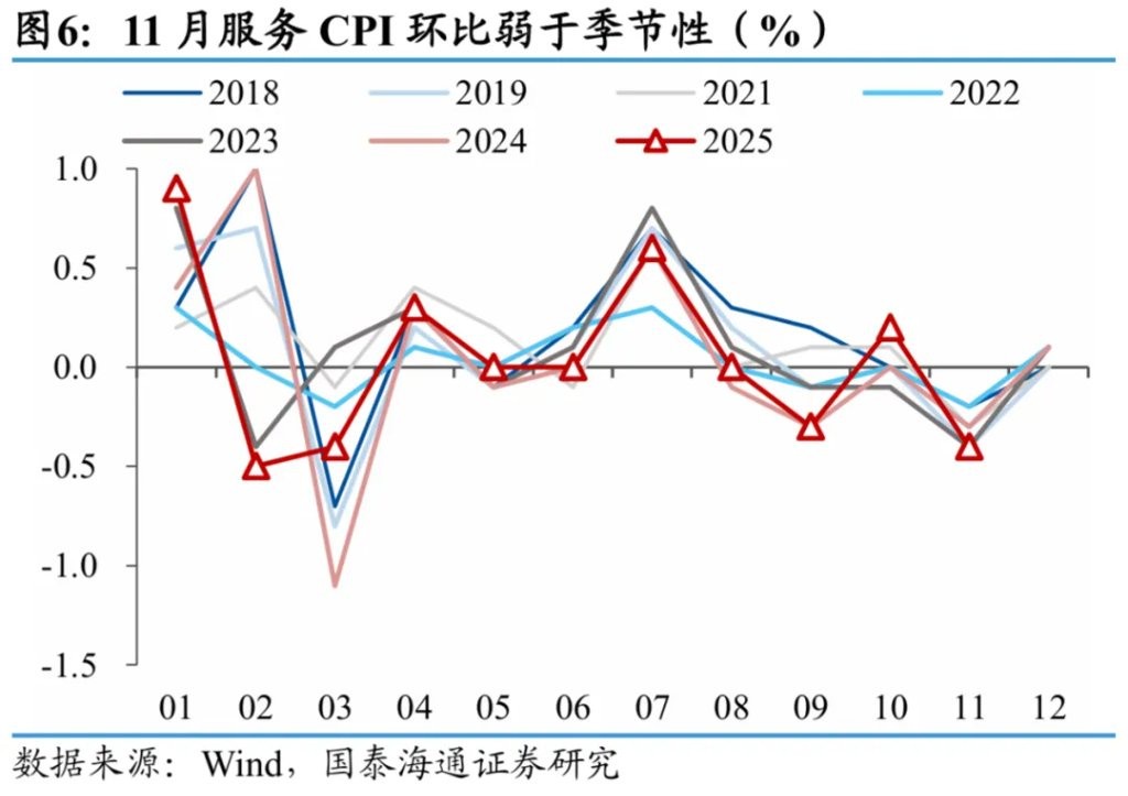 整体上,11 月 CPI 主要受到食品、消费补贴政策及金价上涨推动,核心服务价格仍弱于季节性,仍待政策提振。近期的 “十五五规划” 及中央经济工作会议当中也强调了对于服务消费的重视,我们认为,与 2025 年依靠 “以旧换新” 对实物消费的拉动不同,2026 年物价回暖的关键变量将切换至服务 CPI 的修复弹性。