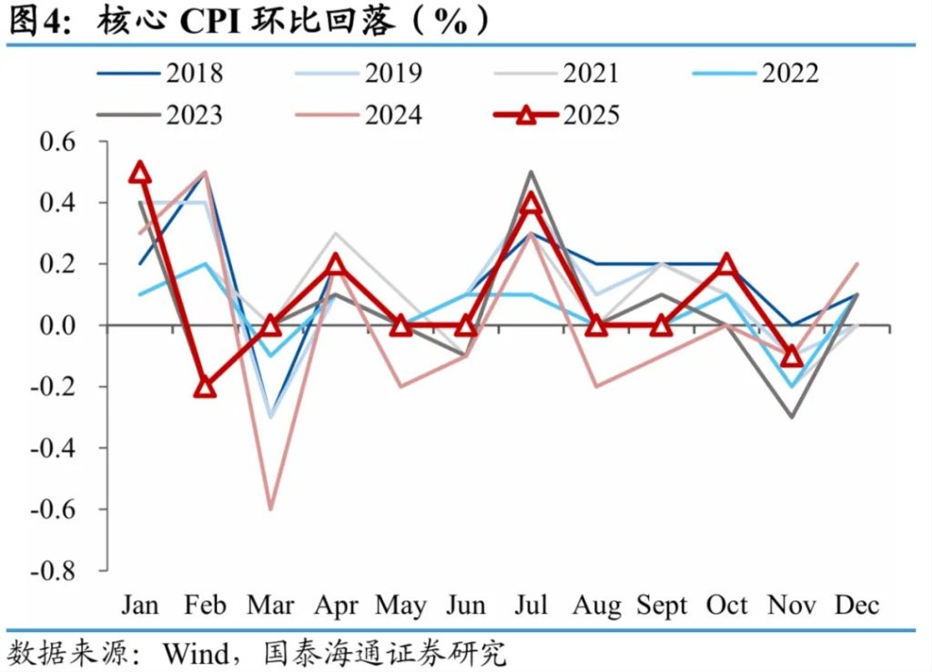 而服务 CPI 则明显弱于季节性。11 月服务 CPI 环比回落 0.4%,弱于 2018-2024 年同期-0.31% 的平均水平。节后出行需求季节性回落,宾馆住宿、飞机票、旅行社收费和交通工具租赁费价格分别下降 10.4%、10.2%、6.2% 和 3.6%,租房市场进入淡季,房租价格下降 0.2%。