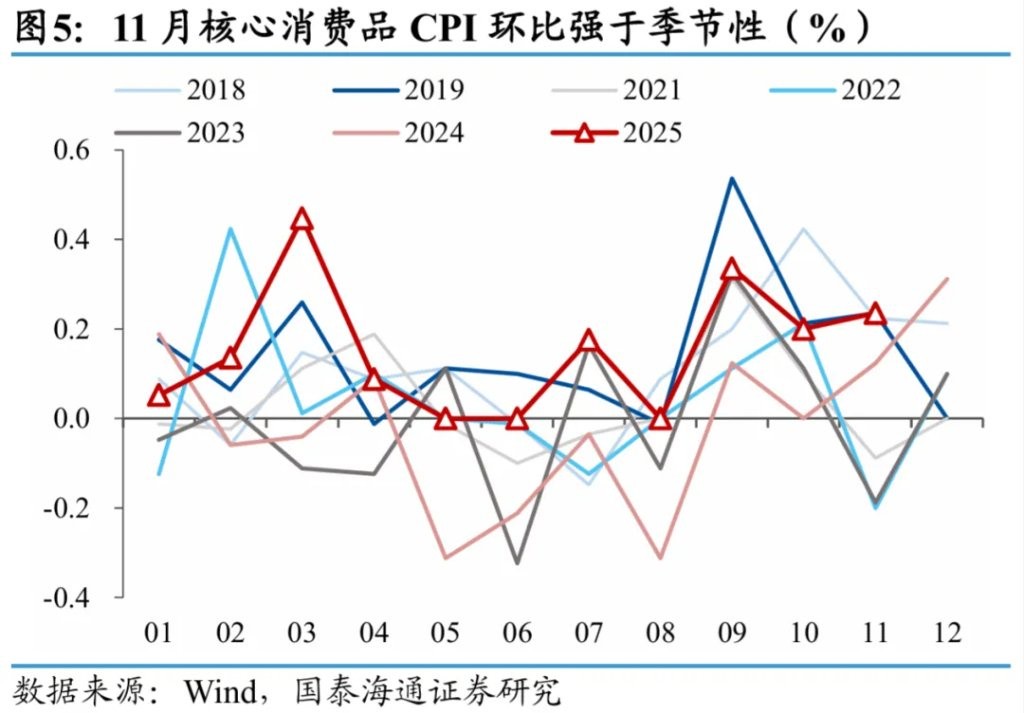 11 月 CPI 主要受到食品、消费补贴政策及金价上涨推动,核心服务价格仍弱于季节性,仍待政策提振。近期的 “十五五规划” 及中央经济工作会议当中也强调了对于服务消费的重视,我们认为,与 2025 年依靠 “以旧换新” 对实物消费的拉动不同,2026 年物价回暖的关键变量将切换至服务 CPI 的修复弹性。