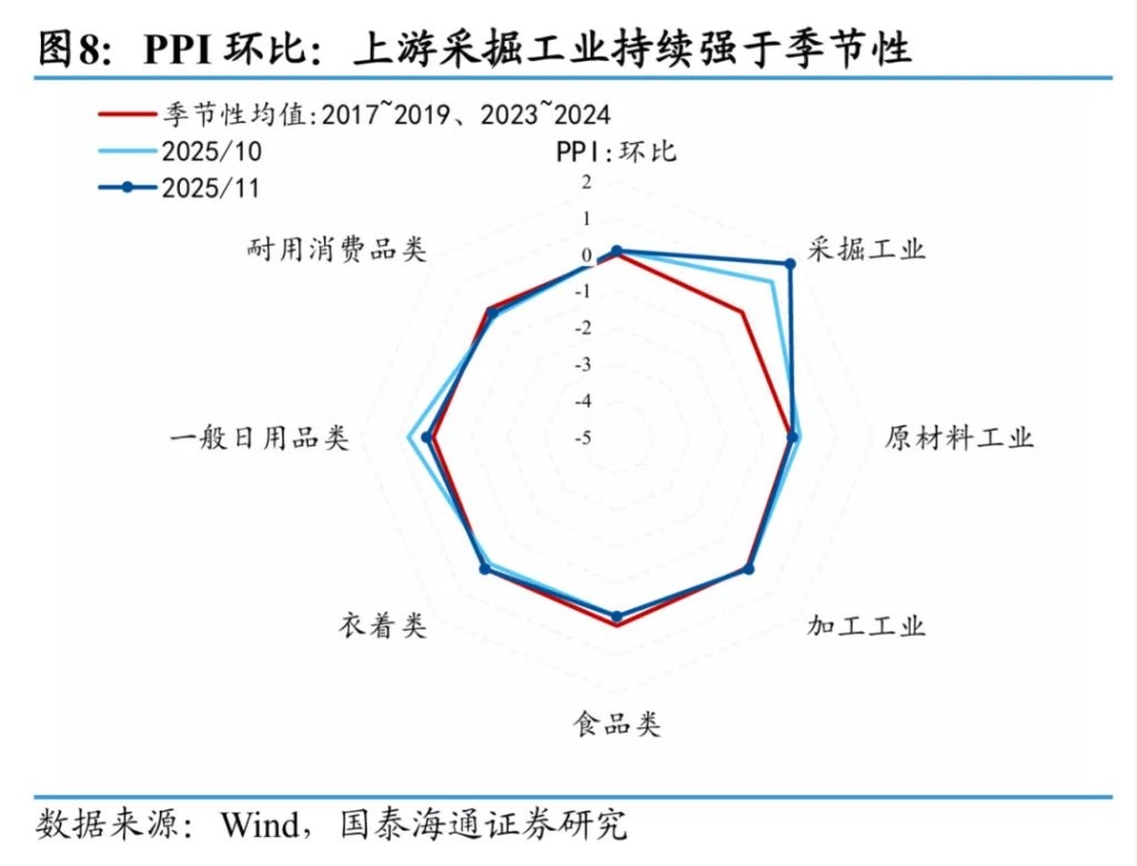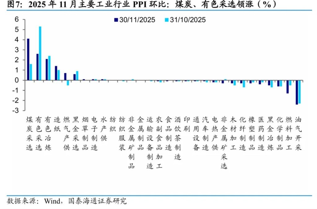 11 月 PPI 表现主要由上游价格支撑,背后驱动因素为全球有色金属涨价,同时 “反内卷” 政策对部分行业的影响仍在体现,而国际油价下行对 PPI 价格形成拖累,下游耐用品消费价格仍然偏弱。往后看,“反内卷” 政策对工业品价格的影响或将持续体现,结合高频数据来看,12 月以来以铜、白银为代表的国际有色金属价格仍在上行,短期输入性因素或将对 PPI 形成支撑,不过上下游价格分化,反映内需仍待提振,后续仍需期待政策发力。