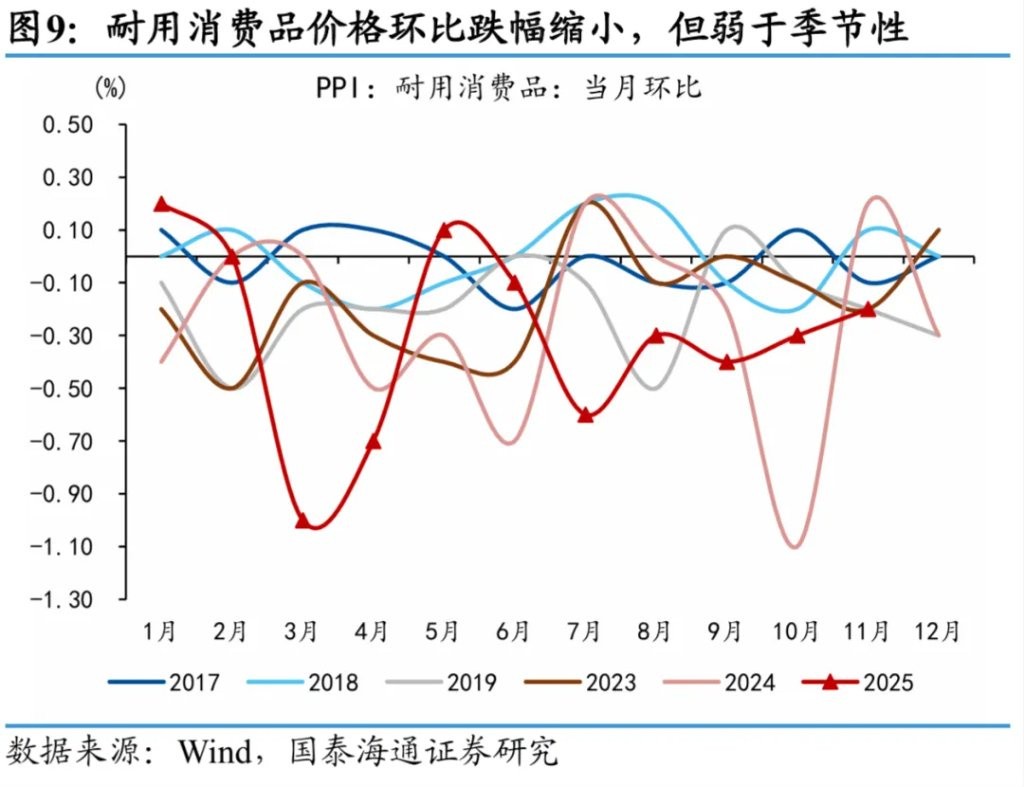 从产业链来看,上游采掘工业价格继续强于季节性,下游耐用消费品价格边际改善但弱于季节性。其中,上游采掘业价格涨幅扩大至 1.7%,明显强于季节性;原材料工业价格环比转为下降 0.2%,稍强于季节性;加工业环比上升 0.1%(前值 0.1%);下游生活资料环比持平(前值 0.0%),具体来看,耐用消费品 PPI 环比跌幅虽小幅收窄-0.2%,但仍弱于季节性,与 CPI 消费品价格的连续走高继续背离。