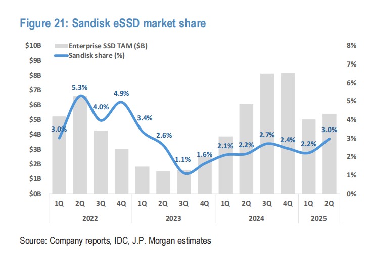 摩根大通指出,闪迪在快速增长的企业级 SSD 市场中处于相对弱势地位。尽管企业级 SSD 市场预计将以 35% 的复合年增长率增长,到 2027 年达到约 450 亿美元规模,但闪迪在该领域的全球市场份额仅为 2-3%,远低于其在整体 NAND 闪存市场约 15% 的份额。