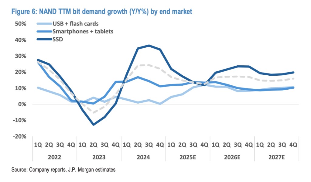 与此同时,传统终端市场需求增速已明显放缓:预计 2025 至 2027 年间,智能手机存储容量的年复合增长率仅为 10%,远低于过去十年 23% 的复合年增长率;客户端固态硬盘的年复合增长率为 11%,也显著落后于企业级固态硬盘 35% 的年复合增长率。