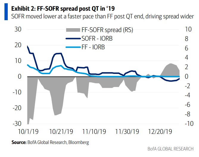 美联储隔夜宣布将根据需要开始购买短期美债,纽约联储同步公告计划未来 30 天买入 400 亿美元短期国债,尽管 RMP 并非 QE 但市场不在乎,美债、美股、比特币、黄金和原油齐涨。美银表示,根据 2019 年的经验,流动性注入将迅速压低担保隔夜融资利率(SOFR),而联邦基金利率(FF)的反应则相对滞后,这种 “时间差” 将为投资者创造显著的套利空间。