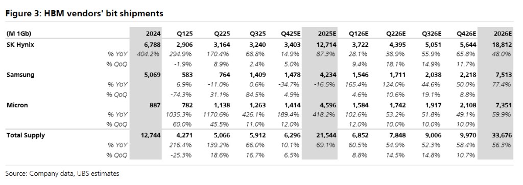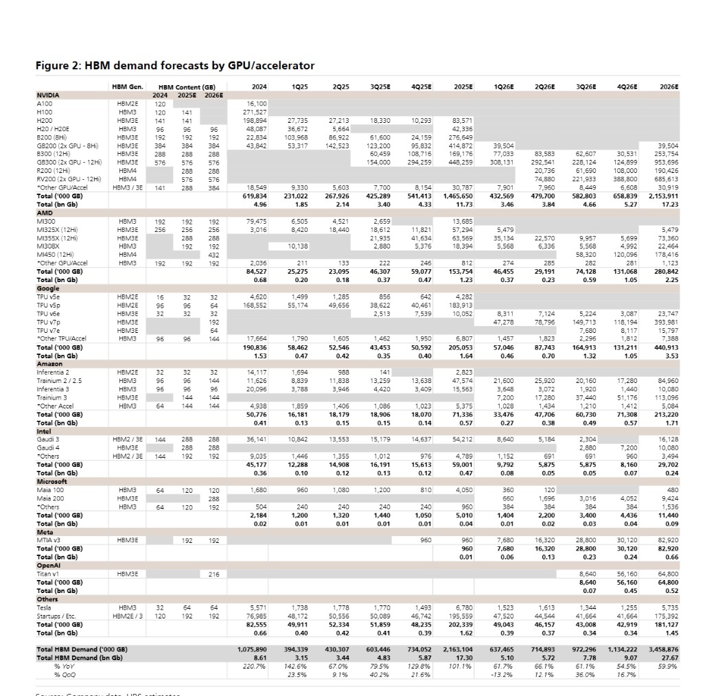 AI 服务器需求激增成为推动因素之一。瑞银预计,2026 年服务器出货量将增长 12.9% 至 1810 万台,其中 AI 服务器虽然数量占比有所下降,但单位存储容量大幅提升。HBM(高带宽存储)需求持续爆发,预计 2026 年需求将达 276.7 亿 Gb,同比增长 59.9%。