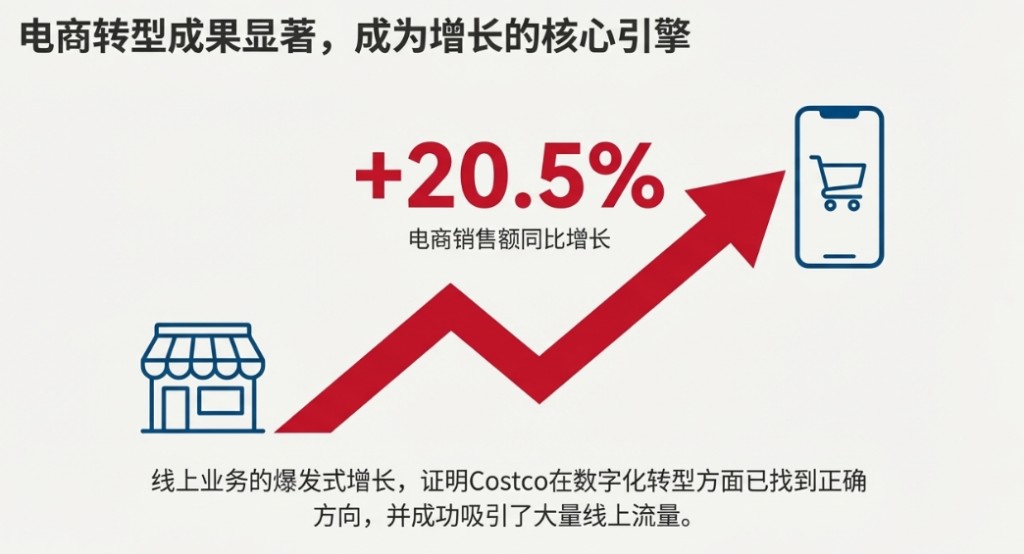 真正值得关注的是电商业务的爆发。电商销售增长 20.5%,网站流量增 24%,App 流量更是飙升 48%,这些数据显示 Costco 终于在电商转型上找到了感觉。