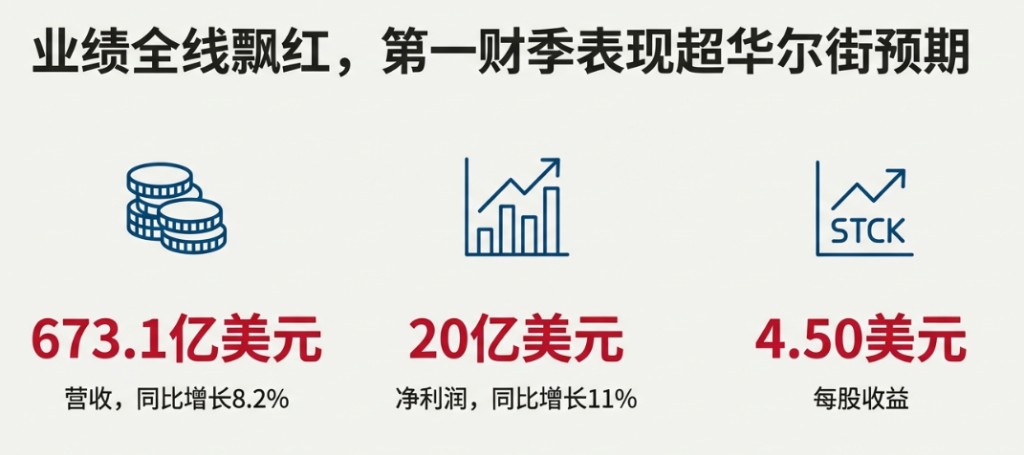 - 财务表现强劲:第一财季营收 673.1 亿美元,同比增长 8.2%,每股收益 4.50 美元,均超华尔街预期;净利润 20 亿美元,同比增长 11%。