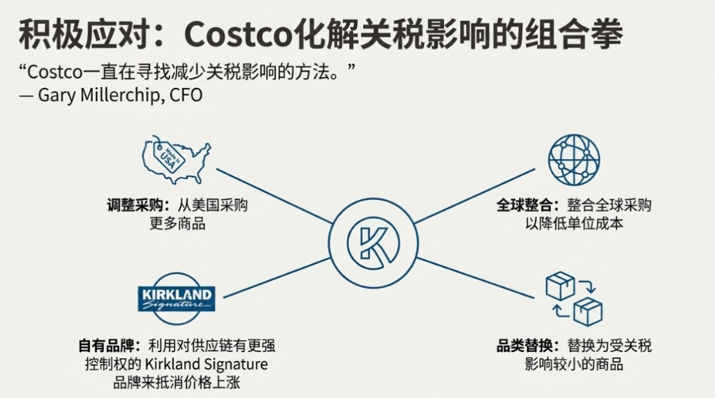 Millerchip 在财报电话会议上表示,Costco 一直在寻找减少关税影响的方法,包括从美国采购更多商品、整合全球采购以降低商品成本,以及将商品类别或商品替换为受高额关税影响较小的类别或商品。