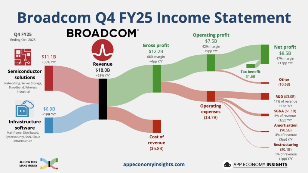 从具体财务数据来看,博通的表现全面超出高盛及华尔街的一致预期。第四财季,公司 AI 半导体收入达到 65 亿美元,高于预期的 62 亿美元;半导体解决方案总收入为 111 亿美元,高于预期的 107 亿美元;基础设施软件收入为 69 亿美元,亦小幅超出预期。
