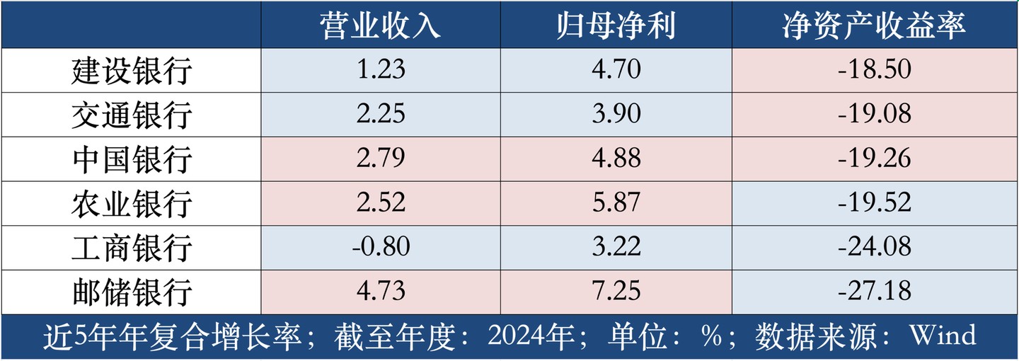 Taking the 5-year compound annual growth rate as an example, by 2024, PSBC's revenue and net profit attributable to the parent company will have compound growth rates of 4.73% and 7.25%, respectively, ranking first among the six major banks;