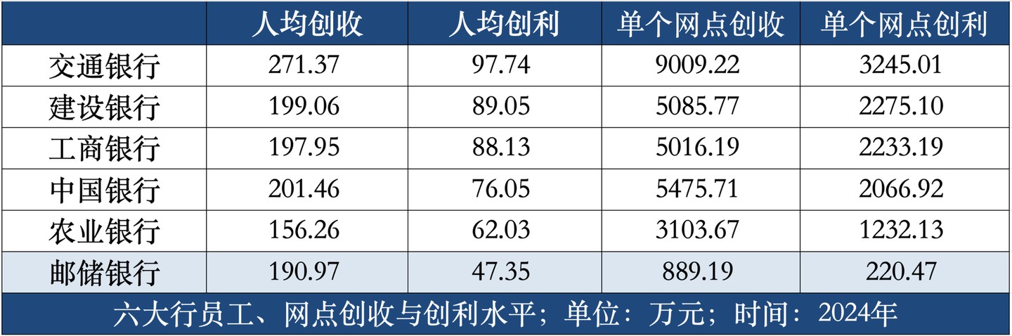 In 2024, PSBC's revenue per capita and profit per capita will be 1.9097 million yuan and 473,500 yuan, respectively, ranking 5th and 6th among the six major banks; the revenue and profit per outlet will be 8.8919 million yuan and 2.2047 million yuan, both ranking 6th among the six major banks, and significantly distant from the other five major banks.