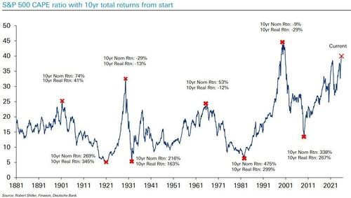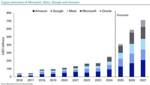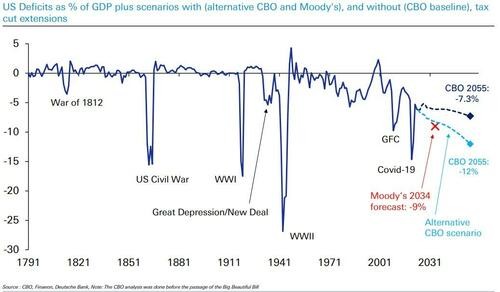 德意志银行特别提到了发达市场主权债务的风险。随着长期收益率接近名义 GDP 增速,曾经的 “债务融资红利期” 已经结束。美国持续的巨额赤字水平通常仅见于战争时期,这将对长期财政可持续性构成挑战。
