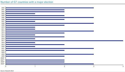 欧洲市场面临截然不同的风险。2026 年将是 21 世纪以来第二次没有安排七国集团(G7)主要成员国选举。这将与过去几年美国、英国和德国都迎来新政府的情况有所不同。