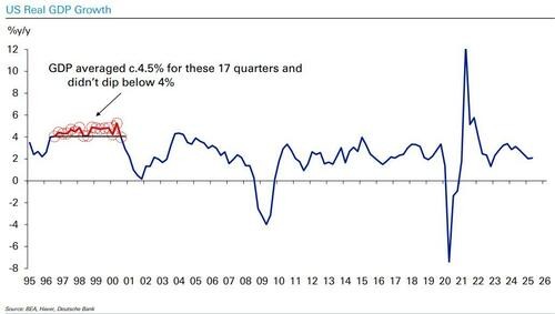 德意志银行指出,1996 年至 2000 年间,美国经济年化增长率曾连续维持在 4% 以上。尽管本轮周期自 2023 年以来表现强劲,但平均年化增长率仅为 2.6%。