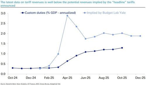 德意志银行指出,目前实际征收的关税收入远低于名义税率暗示的水平,这表明政策 “雷声大雨点小”。