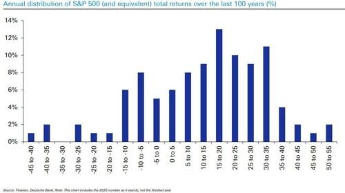 在该行的乐观预测中,标普 500 指数可能在 2026 年达到8000 点,意味着约 17% 的年度回报。从历史数据看,15% 至 20% 的年回报率在过去一个世纪中最为常见,且有近 40% 的年份涨幅更高。此外,即便市场处于泡沫之中,参考互联网泡沫时期的经验,在市盈率达到当前水平后,涨势仍延续了一年。