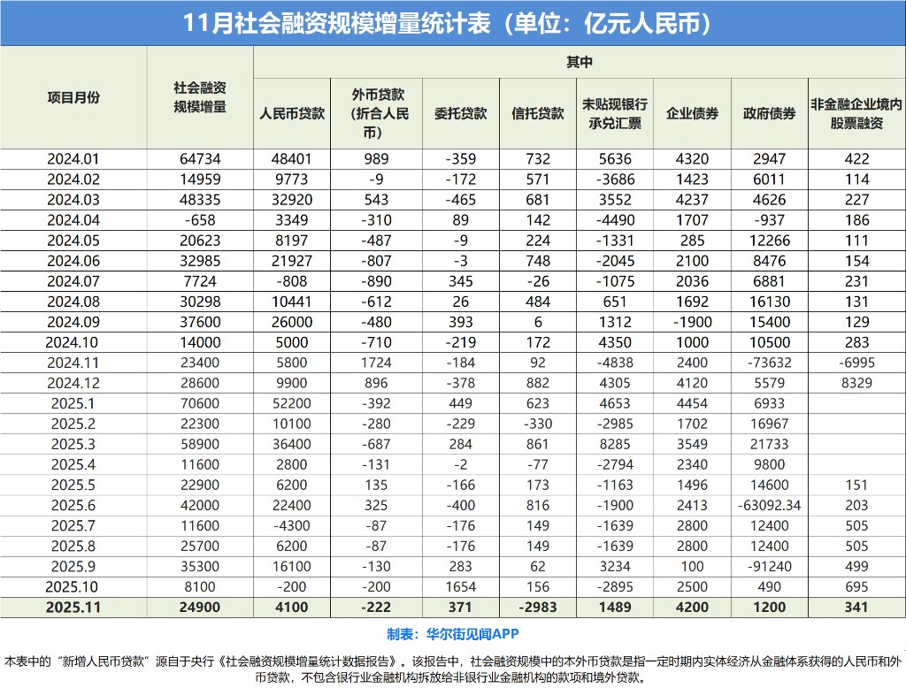 - 2025 年前十一个月,社会融资规模增量累计为 33.39 万亿元,比上年同期多 3.99 万亿元。结合前值计算可得,中国 11 月新增社融 2.49 万亿元。