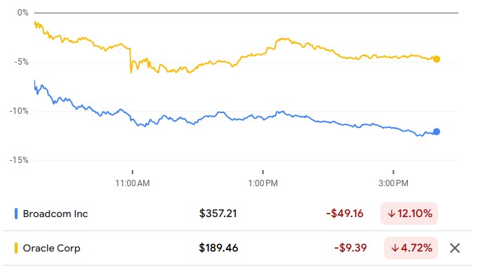 12 月 10 日甲骨文财报显示,支出增长远超分析师预期且将持续,甲骨文股价持续下跌。另一个 AI 紧张情绪的信号是,芯片制造商博通 AI 订单数据令人失望,周五股价暴跌 11%。