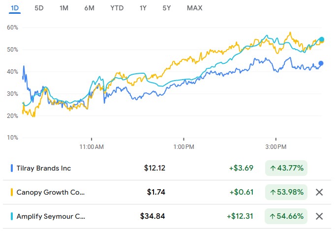 Marijuana producer Tilray Brands soared 44%, and Canopy Growth skyrocketed 53%. The Amplify Seymour Cannabis ETF surged over 54%, marking the fund's best single-day performance ever.