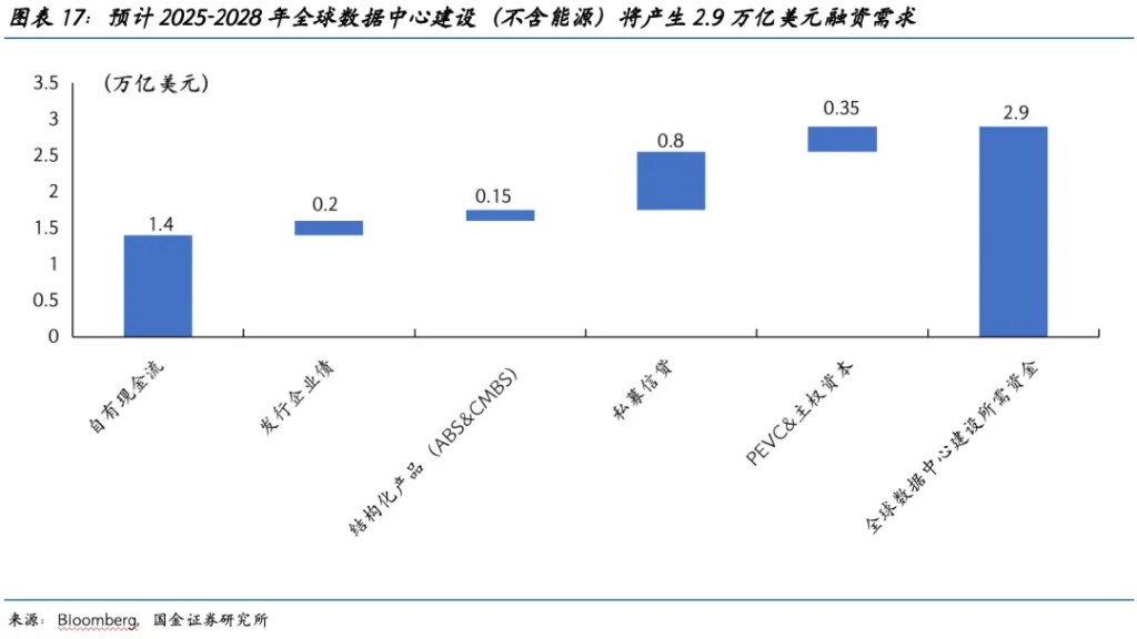 市场普遍认为,仅公开发行企业债恐难以填补巨头们庞大的资金缺口。据预测,2025-2028 年全球数据中心建设将产生 2.9 万亿美元的 Capex 需求,其中 1.5 万亿美元来自外部融资(2000 亿美元公司债、1500 亿美元 ABS 与 CMBS 产品、3500 亿美元 PEVC 和主权资本,8000~1.2 万亿美元依赖私募信贷市场)。私募信贷产品评级和持有人的不透明性,将成为巨大的风险。