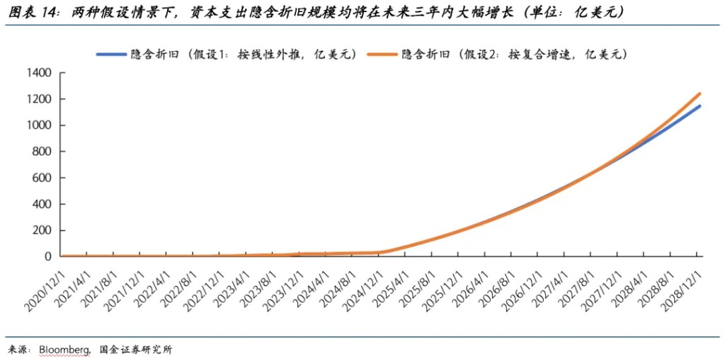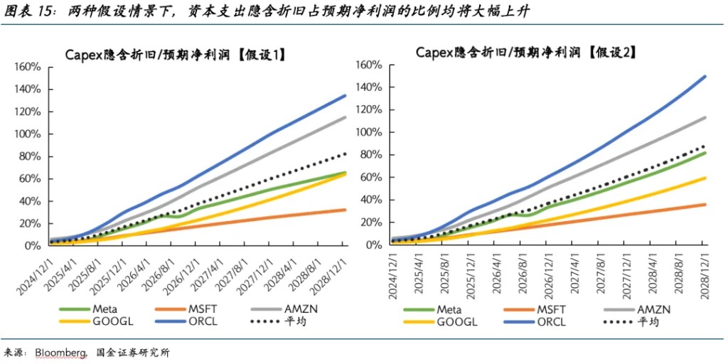 以【假设 1】测算,Capex 隐含折旧将从 2025 三季度的 149 亿美元增长至 2028 年年底的 1145 亿美元,约翻 7.7 倍。到 2026 年底、2027 年底、2028 年底,Capex 隐含折旧/预期净利润将分别达到 37.6%、60.2%、82.0%。