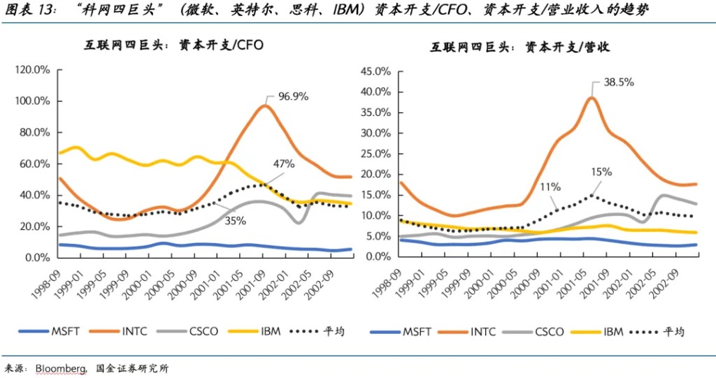 【假设 1】将 AI 五巨头的资本开支、经营性现金流、营业收入均以近一年的平均增速外推:到 2027 年二季度,平均 Capex/CFO 将达到 95.9%,逼近 “科网四巨头(微软、英特尔、思科、IBM)” 中最高的一家(英特尔)在泡沫破裂后的峰值;到 2026 年三季度,AI 五巨头平均 Capex/营收将达到 39.5%,超过英特尔在泡沫破裂后的峰值。