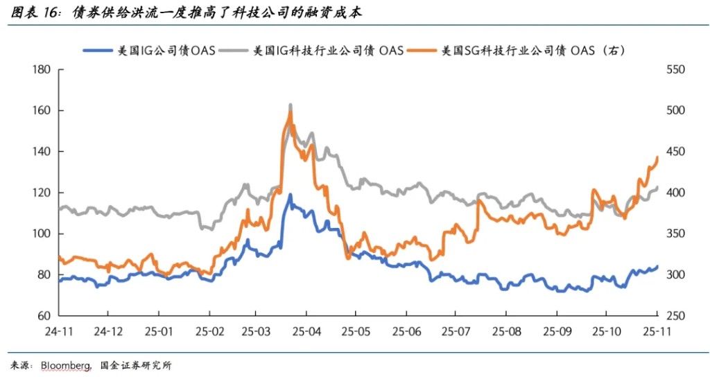 今年前 11 个月,美国 Hyperscaler 企业债的总发行量达到 1038 亿美元(不包含贷款与私募信贷),是 2024 年全年发行量(201 亿美元)的 5 倍以上,规模加权利率也从 4.75% 上升至 4.91%。供给激增已经推高了债券利差,10 月 1 日到 11 月 18 日,甲骨文、Coreweave 的 5 年期 CDS 分别上升 49 个基点、304 个基点,美国投资级(IG)科技企业债、投机级(SG)科技企业债 OAS 利差也分别上行。