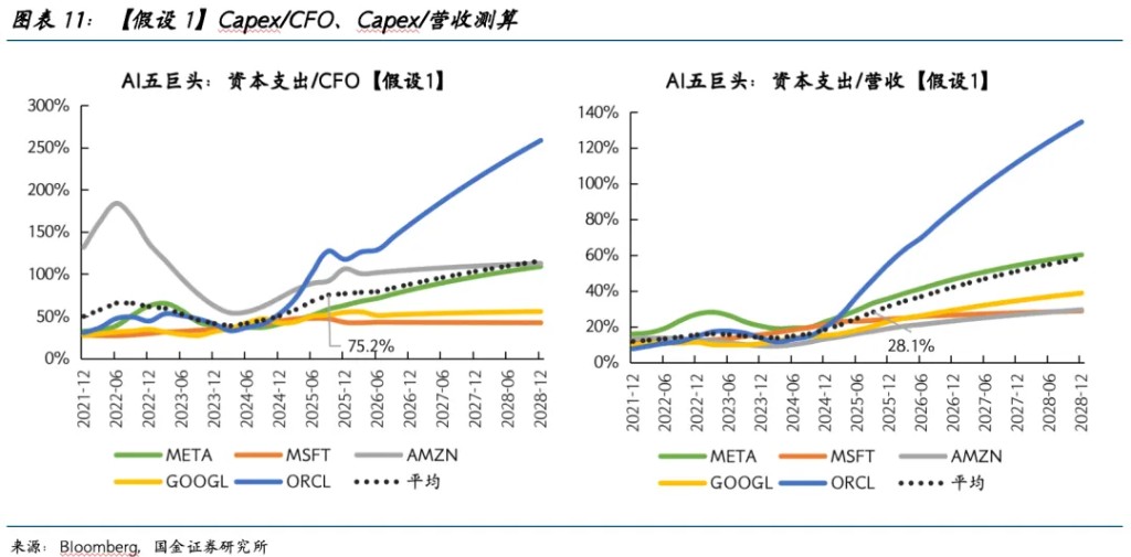 【假设 2】将 AI 五巨头的资本开支以市场预期中值的 2025-2028 年复合增速(CAGR)计算,营业收入、净利润基于彭博一致预期,并保持经营性现金流与净利润的趋势比例不变:到 2026 年三季度,AI 五巨头平均 Capex/CFO 将达到 96.9%,即英特尔在泡沫破裂后的峰值;到 2026 年四季度,AI 五巨头平均 Capex/营收将达到 38.7%,逼近英特尔在泡沫破裂后的峰值。
