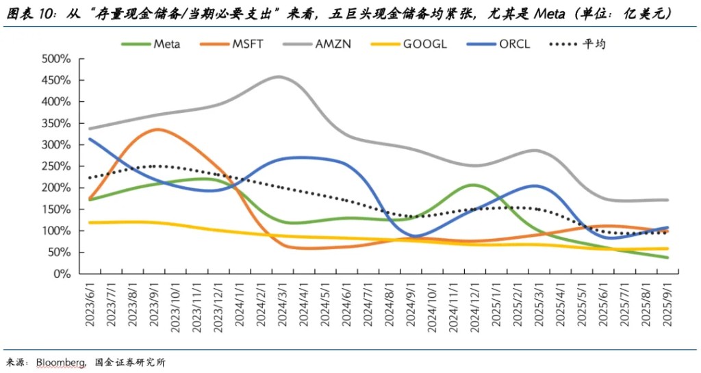 从期末期初平均现金储备对当期必要支出(Capex+ 债务净偿还 + 股利支付 + 回购支出)的覆盖率来看,截至 2025Q3,五家公司平均值为 94.4%,较一年前下降了 39 个百分点,其中 Meta 仅为 37.3%,存量现金储备的安全垫未来可能更加稀薄。