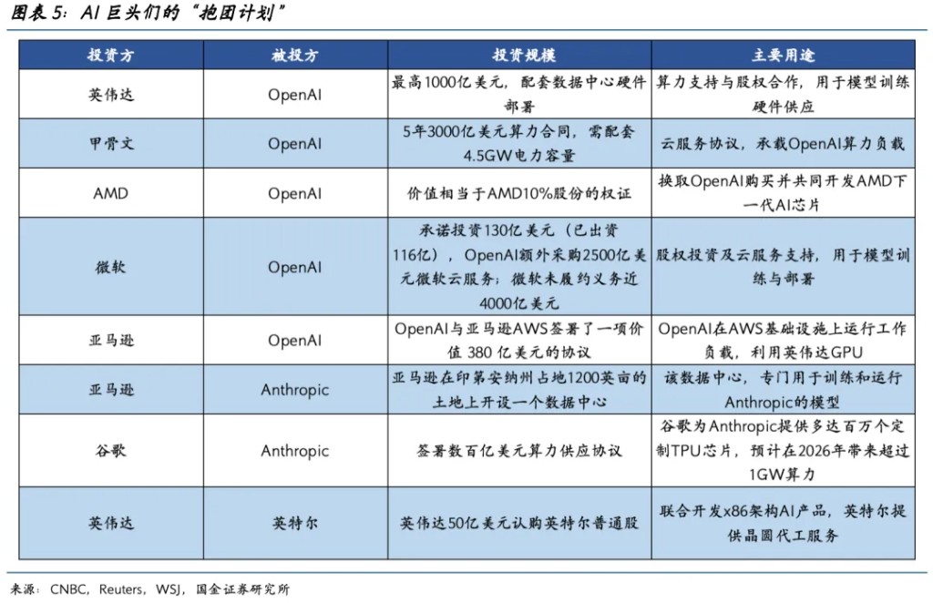 近一年里,上述三个层级内的企业涌现出多个跨层级的、引人注目的巨额投资交易。产业链市场化整合,从芯片制造、云计算到 AI 应用的交叉投资合作,虽有助于整合产业链资源、改善芯片供应、算力支持和应用场景,阶段性地推动了业绩和估值上升,甚至改善了融资能力,但这一趋势也模糊了传统行业边界,可能造成需求假象,造就产业链的脆弱性。如果 AI 巨头自身的业务盈利预期无法产生足够利润与现金流,同时流动性环境边际恶化时,整个链条可能因 “信仰受损” 而面临较大风险。